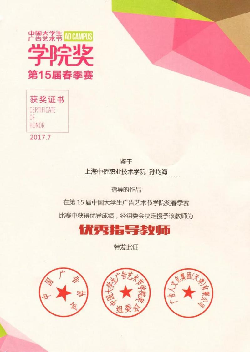 近日,从中国大学生广告艺术节第十五届春季赛组委会传来喜讯,我校艺术学院16级广告专业朱妍颖、李宣言、张依依三位同学合作的作品获得全国“学院奖”优秀奖,孙均海老师获得优秀指导教师。