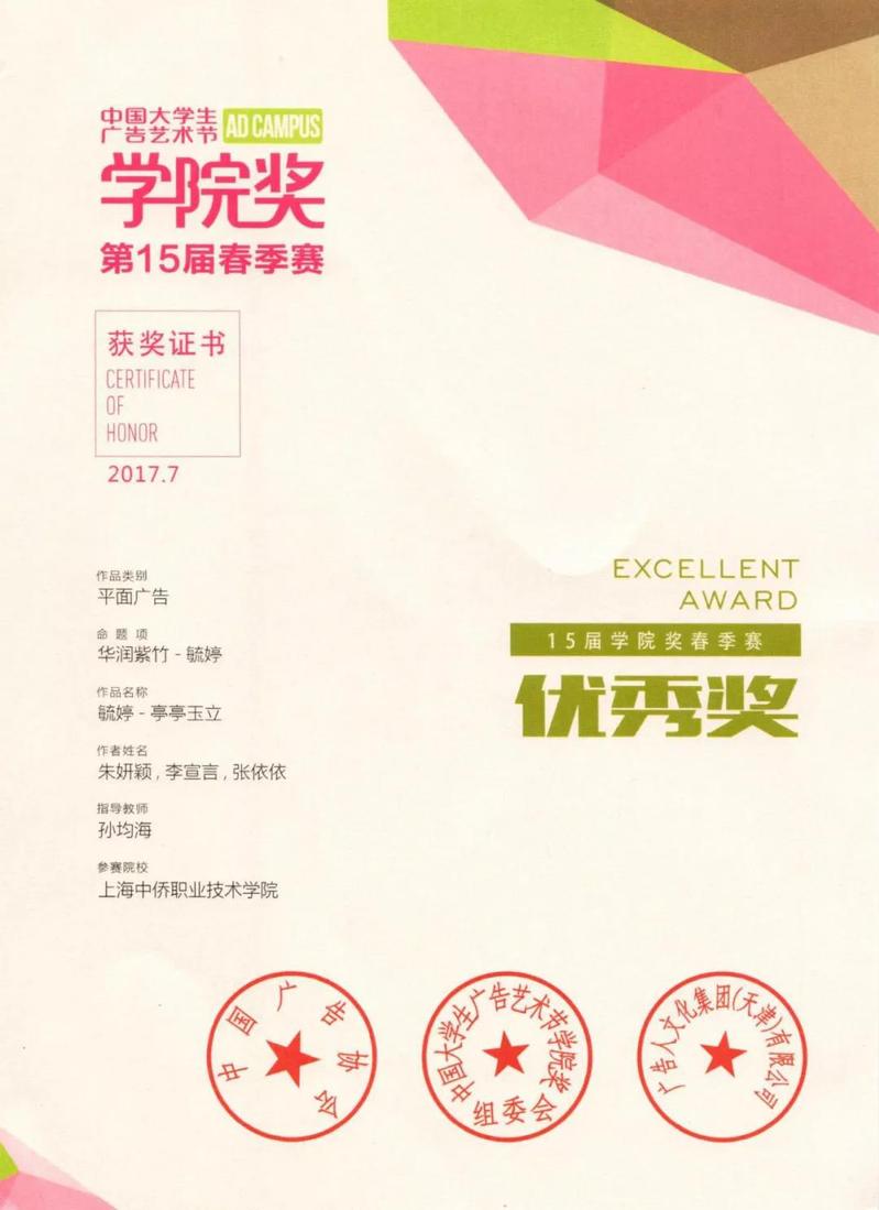 功夫不负有心人,厚积薄发创辉煌。朱妍颖、李宣言、张依依三位同学的作品荣获优秀奖,为中侨职业技术学院争得了荣誉,为艺术学院参加2017年国家级技能大赛画上了一个圆满的句号!