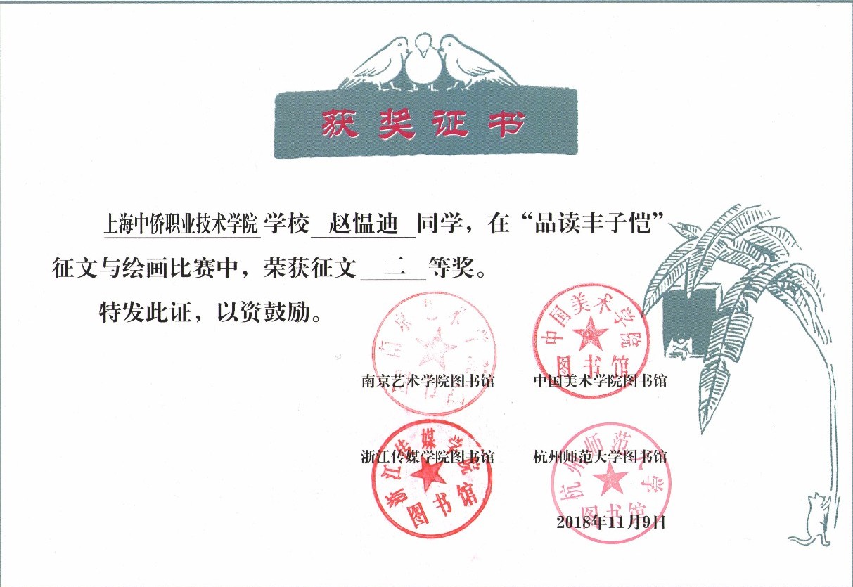 为纪念丰子恺先生诞辰120周年,南京艺术学院图书馆、中国美术学院图书馆、浙江传媒学院图书馆、杭州师范大学图书馆等单位联合举办了面向全国大学生的“品读丰子恺”征文与绘画比赛,结果于日前揭晓。经济与管理学院17国商班赵愠迪同学的《久X自己》获得了征文二等奖。
