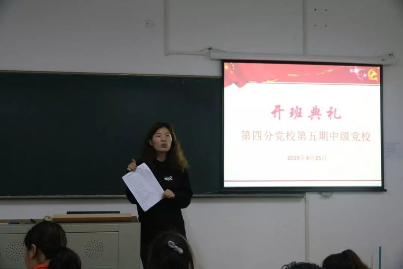 2019年4月25日18:30,信息与机电学院第四期分党校第五期中党开班典礼于4号楼405教室举行。信息与机电学院党总支书记刘群,学院第一支部书记姜晶晶,第二支部书记杨芬菲等出席开班仪式。仪式由院党总支组织委员胡婉君主持。开班仪式在庄严的国歌声和国旗的见证下拉开序幕。