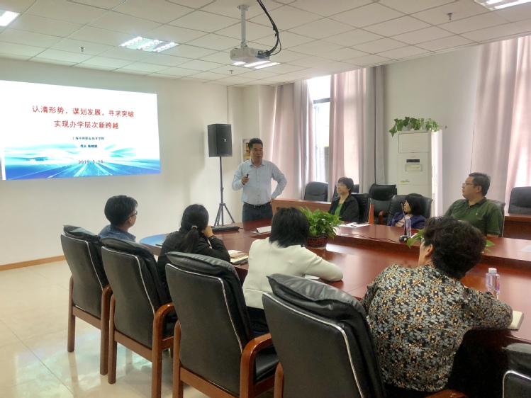 校长陈晓斌教授就国家职业教育改革发展为基线讲述我校如何实现办学层次新跨越。结合学校办学层次和办学定位优化学校、专业布局,形成专业特色、办学特色。要注重学用相长,知行合一,着力培养学生的创新精神和实践能力,增强学生的职业适应能力和可持续发展能力。进入新时代,学校亟需抢抓历史机遇,积极应对新的挑战,面向全国,面向全球,面向未来,以最高的历史站位和更广的战略视野,科学谋划和加快推进职业教育改革。
