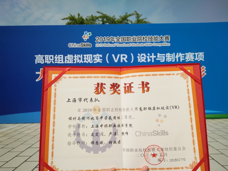 2019年全国职业院校技能大赛高职组虚拟现实(VR)设计与制作赛项,于5月29号在南京拉开帷幕,以皮定彧、卢涛、熊峰三位同学在镡忠斌、胡婉君两位指导老师的带领下,代表上海市参加了此次国赛。来自全国各地80支队伍,经过240名选手间的角逐最终获得了国赛三等奖的好成绩。看着这沉甸甸的证书,回想这一点一滴的走来,没有一步登天,惟有坚持勇敢向前,再次向社会展示了我校学生的良好素质和精湛技能。