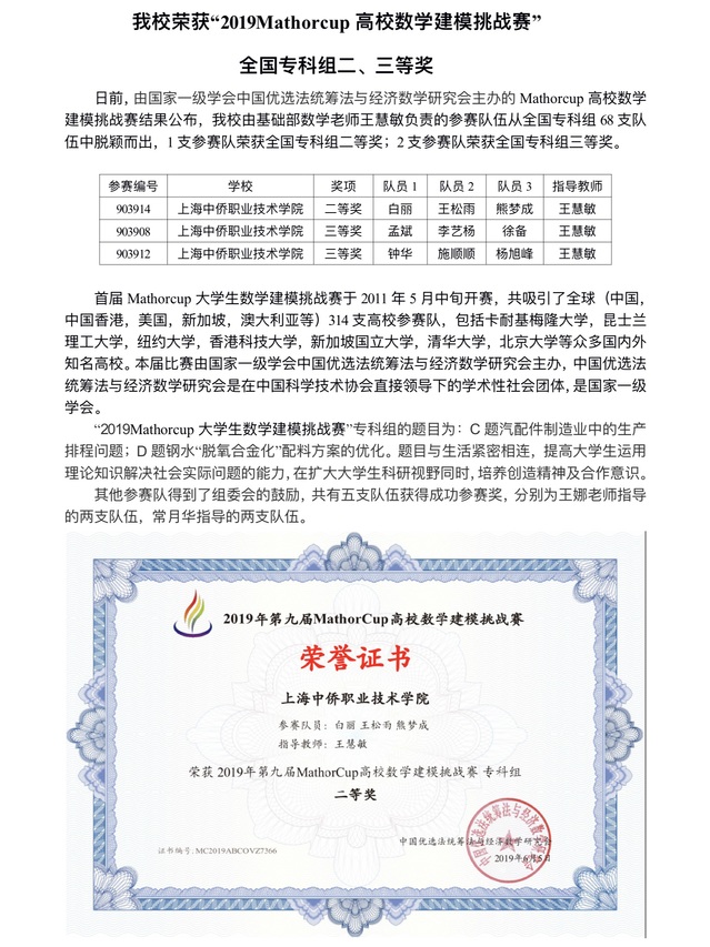 我校荣获“2019Mathorcup高校数学建模挑战赛”全国专科组二、三等奖