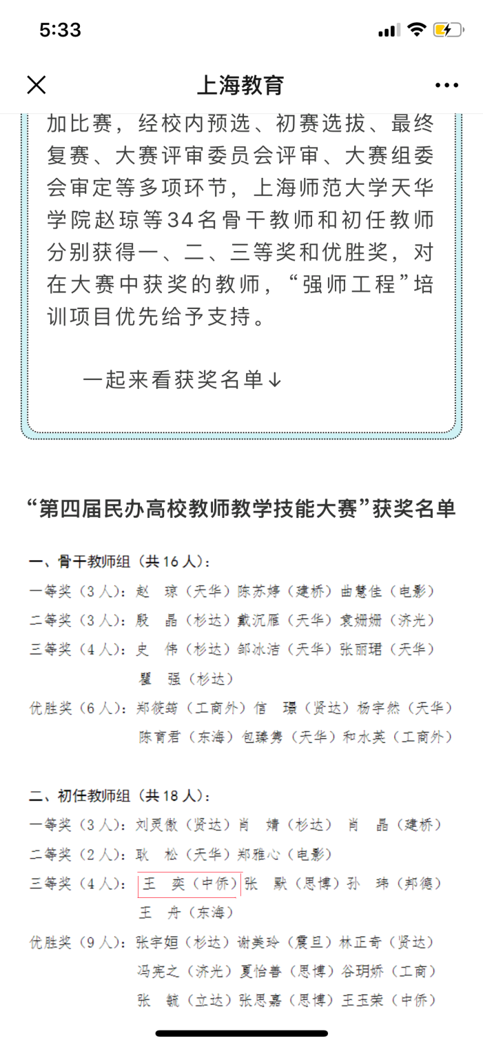 2019年上半年,上海市民办高校教师专业发展中心举办了上海市“第四届民办高校教师教学技能大赛”。信息与机电学院王奕老师荣获三等奖,王玉荣老师荣获优胜奖。此次比赛由17所民办高校共有97名教师参加比赛,经校内预选、初赛选拔、最终复赛、大赛评审委员会评审、大赛组委会审定等多项环节。