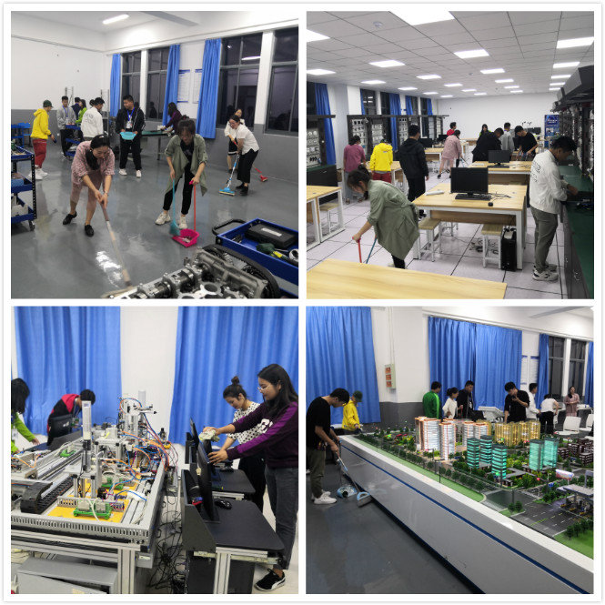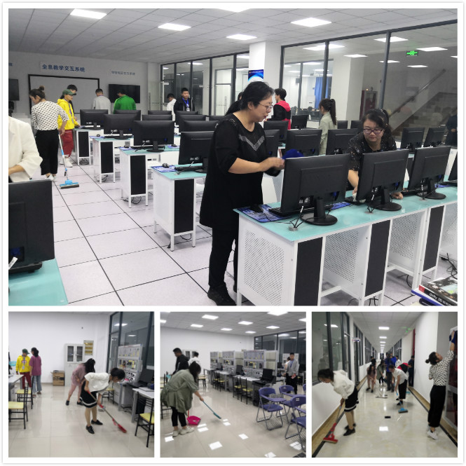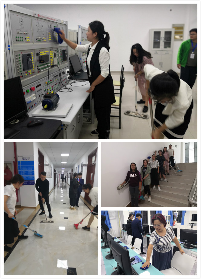 师生们拿着拖把、毛巾、水桶、扫帚、刷子、清洁剂等,对我院9号楼教室、实训室、地板、门窗、楼梯、走廊以及教室的桌椅、卫生间等进行大清洗、大清洁,不放过任何一个角落。大家忙的不亦乐乎,各种脏活累活抢着干,齐心协力,相互合作,用劳动的汗水换取了我院优美、洁净的环境。