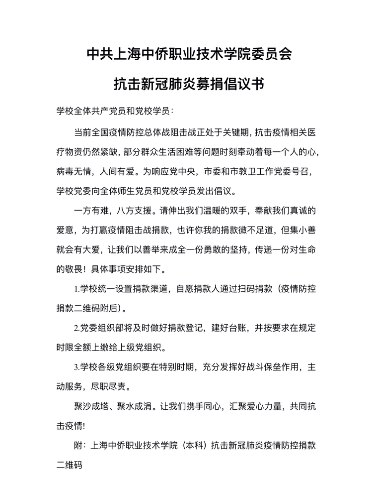 中共上海中侨职业技术学院委员会抗击新冠肺炎募捐倡议书