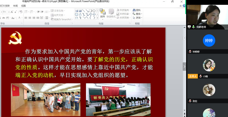 2020年4月23日晚上19:00,第四分党校第七期入党积极分子培训班第一次党课通过借用腾讯会议顺利举行。本次党课的主讲人是信息与机电学院党总书记刘群老师,主题为《学党史、知党情、跟党走》,希望通过对党史的讲解,让同学们更深一步了解党的光辉历程,更加坚定爱党信念。