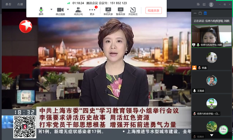信息与机电学院党总支于2020年5月26日20:00通过腾讯会议召开了 “开展四史学习,坚定理想信念“主题党日活动。会议由党总支副书记赵欣老师主持,党总支书记刘群老师以及全体党员共同参与了此次主题生活会。