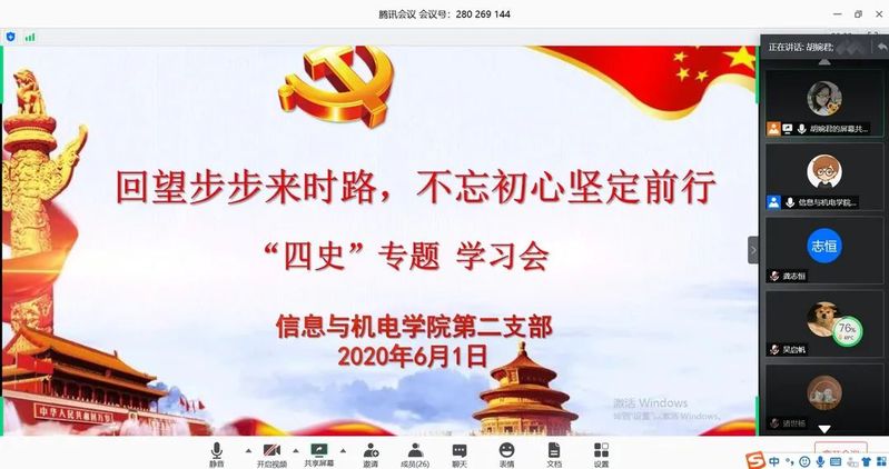 根据校党委“四史”学习教育工作部署,为加强对党员和发展对象的“四史”教育,信息与机电学院第二党支部围绕“四史”学习内容要求于2020年6月1日18:30通过腾讯会议开展了主题为《回望步步来时路,不忘初心坚定前行》的线上专题学习会。全体党员、发展对象一起学习,会议由党支部书记胡婉君老师主持。