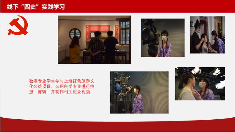学院开展“留住红色记忆,寻访红色足迹”的主题活动,全体党员同志、入党积极分子紧紧围绕主题,寻找红色基地进行实地参观学习,截止目前,学院20余名学子积极响应号召,利用课余时间参与实践活动,通过“红色基地打卡”让广大青年走进红色展馆,重温红色记忆,传承红色基因。我们数媒专业学生参与上海红色旅游文化公益项目,运用所学专业进行拍摄,剪辑,并制作相关记录视频,通过寻访红色足迹,传承红色基因,为上海市的红色文化建设做自己的奉献。
