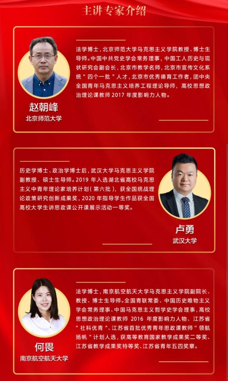 党史思政大课由北京师范大学赵朝峰、武汉大学卢勇、南京航空航天大学何畏等三位老师主讲。他们从新民主主义革命、社会主义建设、改革开放、中国特色社会主义新时代等历史时期介绍了中国共产党的百年伟大成就。三位思政“大咖”围绕“马克思主义与中国共产党的百年辉煌”“中国共产党与中华民族的伟大复兴”“中国共产党革命精神形成与传承的百年历程”三大主题,回顾百年党史,回忆百年发展,见证中国力量、中国奇迹。