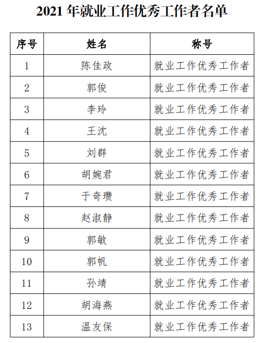 为进一步提升学校就业创业工作队伍水平,激励先进,树立典型,更好地调动和激励就业创业工作队伍的积极性和创造性,会上对护理与健康学院等4家单位就业优秀集体,刘群等12名就业工作优秀个人,黄杰等28名创业工作优秀个人进行表彰。
