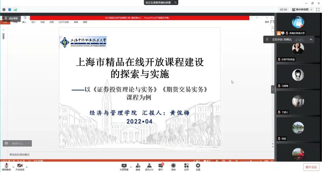会上,证券实务专业主任黄侃梅副教授以《上海市在线精品课程的建设与实践》为题,结合自己所承担的两门在线精品课程建设历程,从课程建设概况、课程建设成绩、课程建设的反思、课程建设的不足及展望四个方面,详细介绍了自己及其团队在精品课程建设中的有益做法和体会。黄老师的精彩交流分享,在全体教师中产生积极反响,大家认为,黄老师的精彩汇报,不仅对经管学院今后的精品课程建设有重要借鉴意义,而且对全校的精品课程建设同样具有指导意义。