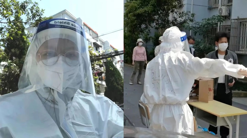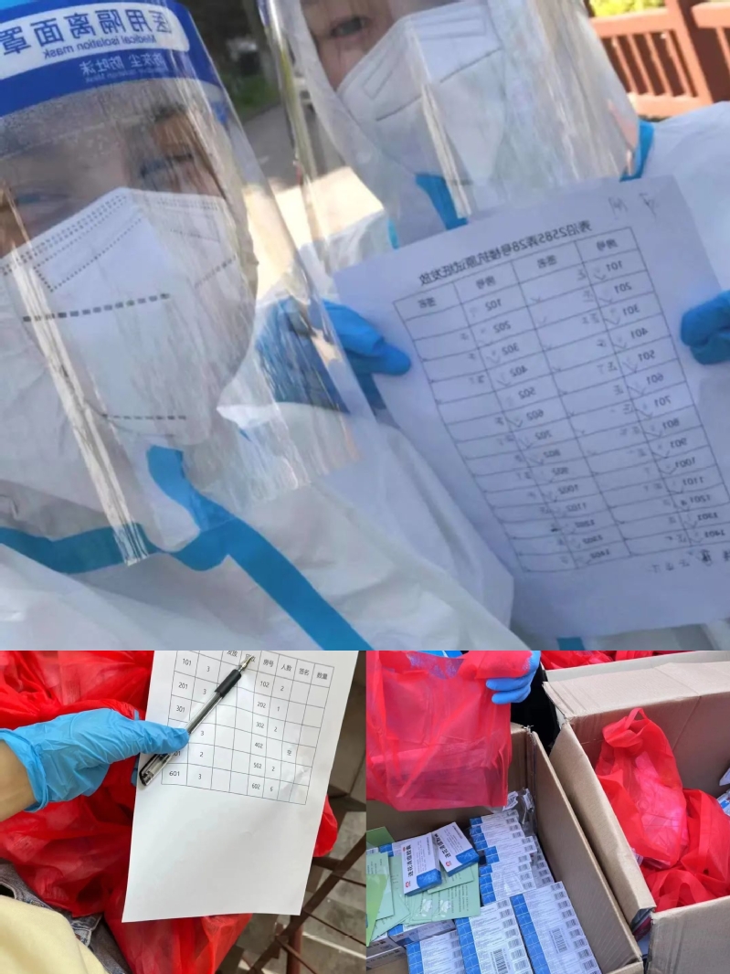 抗原试剂发放岗位上,一层一层地爬楼,一户一户地敲门,不厌其烦地一遍又一遍讲解使用方法和指导居民使用试剂,并一起帮助一些不会操作的居民完成了测试。