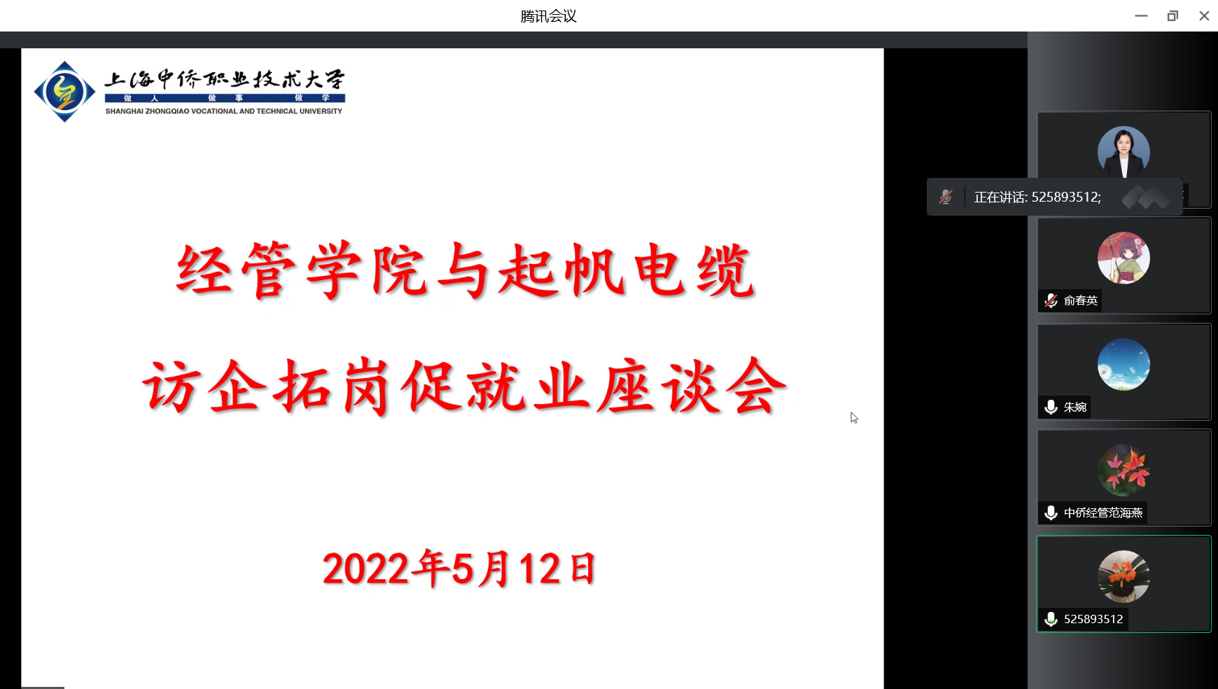 为深入贯彻落实党中央、国务院关于高校毕业生就业工作的决策部署和学校2022年“访企拓岗促就业”专项行动,2022年5月12日,经济与管理学院党总支书记杨慧老师,教学副院长范海燕教授,国际商务专业主任俞春英老师,线上拜访了上海起帆电缆股份有限公司人力资源部钱军玲部长,朱婉老师,并出席学校和企业联合举办的“访企拓岗促就业”专项座谈会暨线上会议。