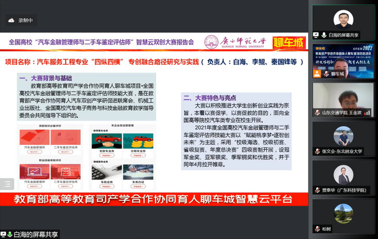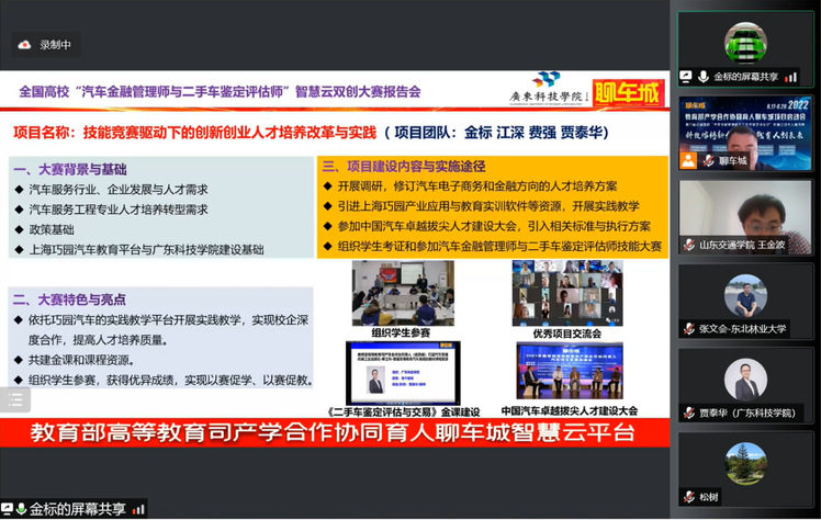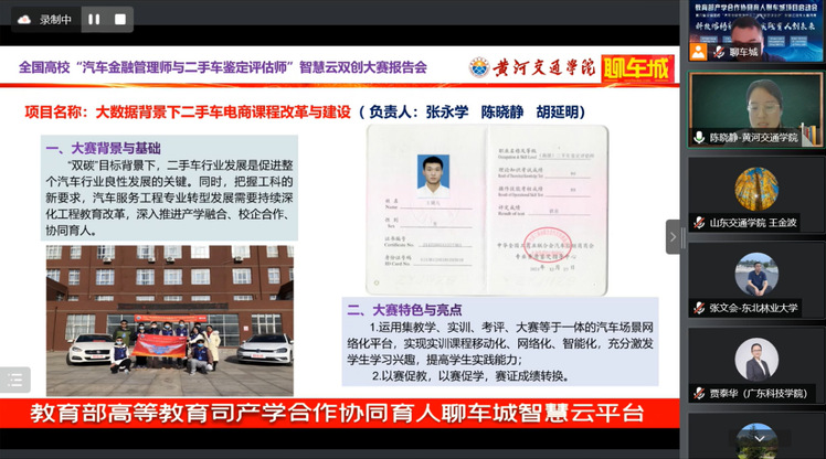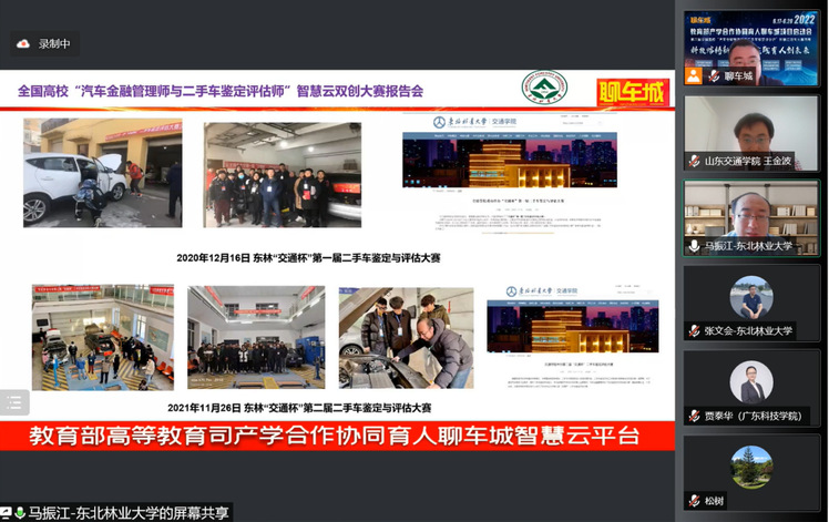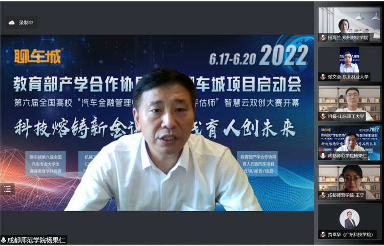 2022年6月18日,教育部产学合作协同育人聊车城项目启动会暨2022年全国高校汽车金融管理师与二手车鉴定评估师智慧云双创大赛开幕式如期举办。本届大会以“线上+线下”相结合的方式举办,线上通过腾讯会议室参会,并在重庆设立主会场。会议主题为“科技熔铸新金课·实践育人创未来”,会议共邀请来自全国各省市61名高校领导、教师及汽车产业学者、行业专家、名企高管参加。我校智能制造学院院长黄立新、教师李光代表项目组成员参加了此次盛会,共话育人未来,传递时代强音。