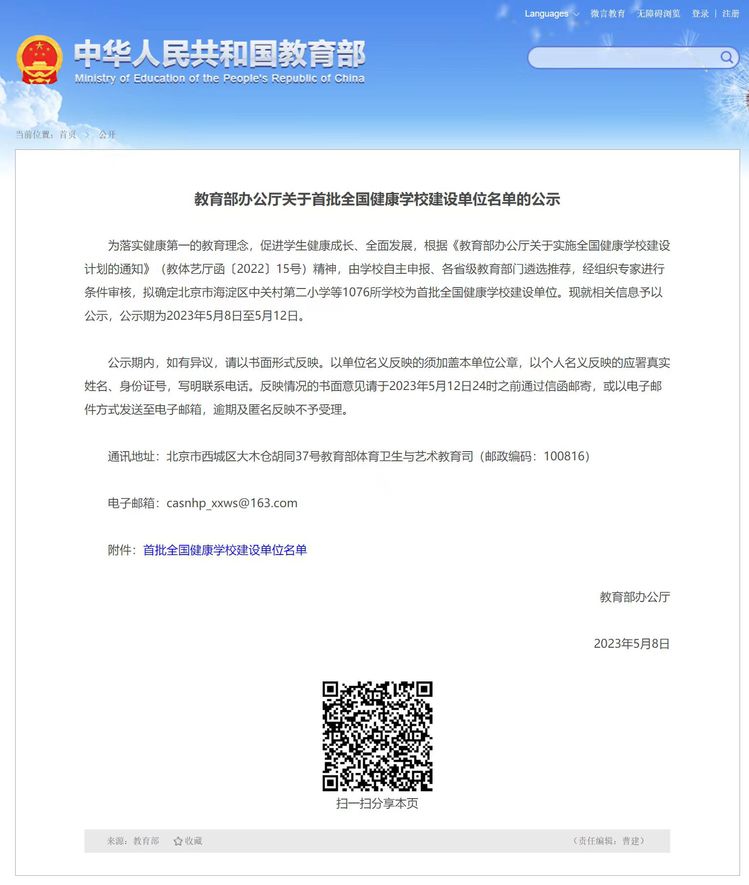 为贯彻落实《中国教育现代化2035》、《国务院关于实施健康中国行动的意见》精神,根据《教育部等五部门关于全面加强和改进新时代学校卫生与健康教育工作的意见》和健康中国行动中小学健康促进专项行动要求,近日,教育部办公厅印发《关于实施全国健康学校建设计划的通知》(以下简称《通知》),决定“十四五”期间,重点支持一批有条件的学校建成全国健康学校,大幅提高学校立德树人质量和健康促进水平,完善德智体美劳全面培养的教育体系,提高学生身心健康水平和健康素养,提升学校卫生健康工作规范化、制度化、信息化和现代化水平。上海中侨职业技术大学作为上海8家高校之一入选教育部首批全国健康学校建设单位。