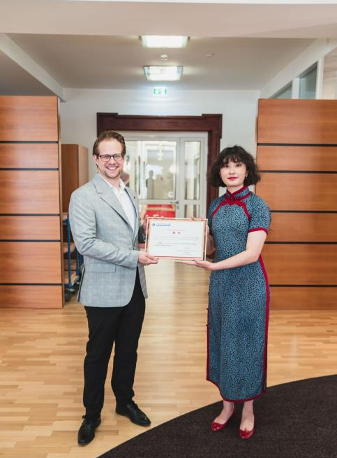 2023年6月19日,我校国际教育学院严蕙院长受邀参访了德国巴登符腾堡双元制应用技术大学(DHBW)。双方见面会上,巴登符腾堡双元制应用技术大学(DHBW)代表对严蕙院长的到来表示热烈欢迎,严蕙院长为DHBW副校长Johannes Kern颁发了国际教育学院专家证书。