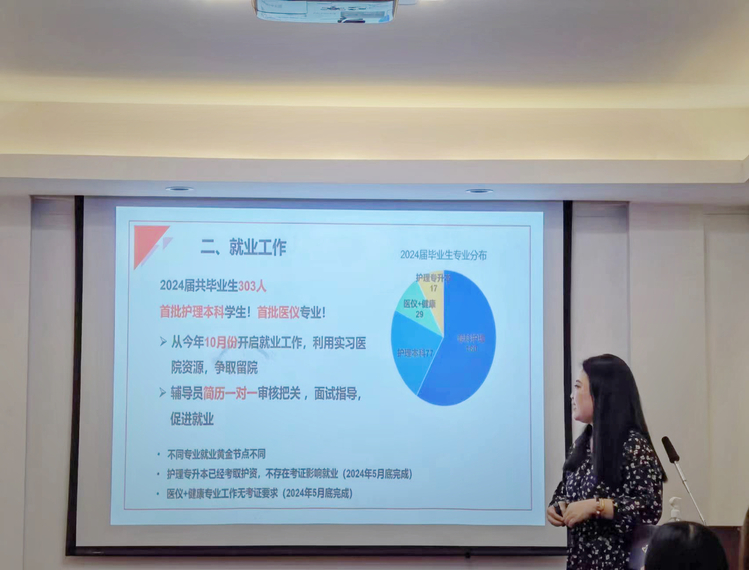 随后,护理与健康学院直属党支部副书记郭帆,从党建工作、就业工作、创新创业以及外事等工作进行详细汇报。同时,表示下一步将继续积极统筹学院学生事宜,并积极推进学生第二课堂工作。深入总结经验、广泛凝聚共识,以问题为导向,提高工作针对性和实效性,当好大学生成长成才的引路人。