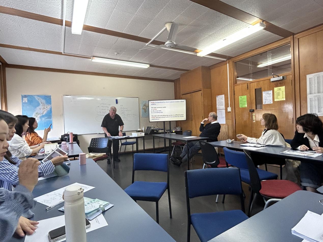 上海中侨职业技术大学师资培训团一行受到奥克兰商学院的热情接待。奥克兰商学院NZCEL教学负责人Shaun、Dora以及学术写作负责人David Jordan为参训教师介绍NZCEL-4、NZCEL-5的考试内容及考试安排。NZCEL全称为New Zealand Certificate in English Language,即新西兰国家英文证书。NZCEL共分1至5级,分别对应不同的雅思分数,每完成一个级别的课程,学生将获得新西兰教育局(NZQA)颁发的证书,学完此证书课程的学生可以以学术目的使用英文。师资培训团主讲教师Richard为大家进行教学培训,以课程内容为抓手让参训教师们体验语言课程的教学氛围。