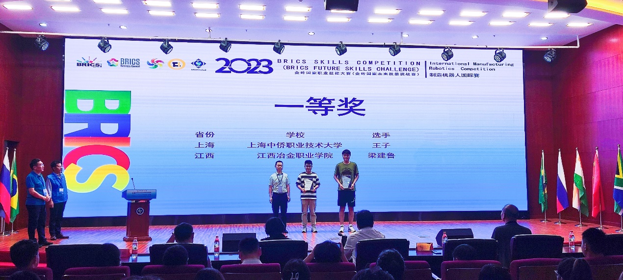 上海中侨职业技术大学、江西冶金职业技术学院2所院校荣获一等奖。金砖国家职业技能大赛中方竞赛办公室三处处长程帅为一等奖获得者颁奖。