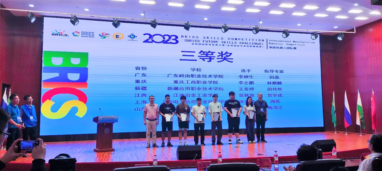 制造机器人赛项裁判长徐建省宣布获奖名单:广东岭南职业技术学院、重庆工商职业学院、新疆应用职业技术学院、江西冶金工业学校、上海电子信息职业技术学院、临朐县职业教育中心学校6所院校荣获三等奖。上海中侨职业技术大学教务处副处长刘英语、上海因仑信息技术有限公司总经理韩学能为三等奖获得者颁奖。