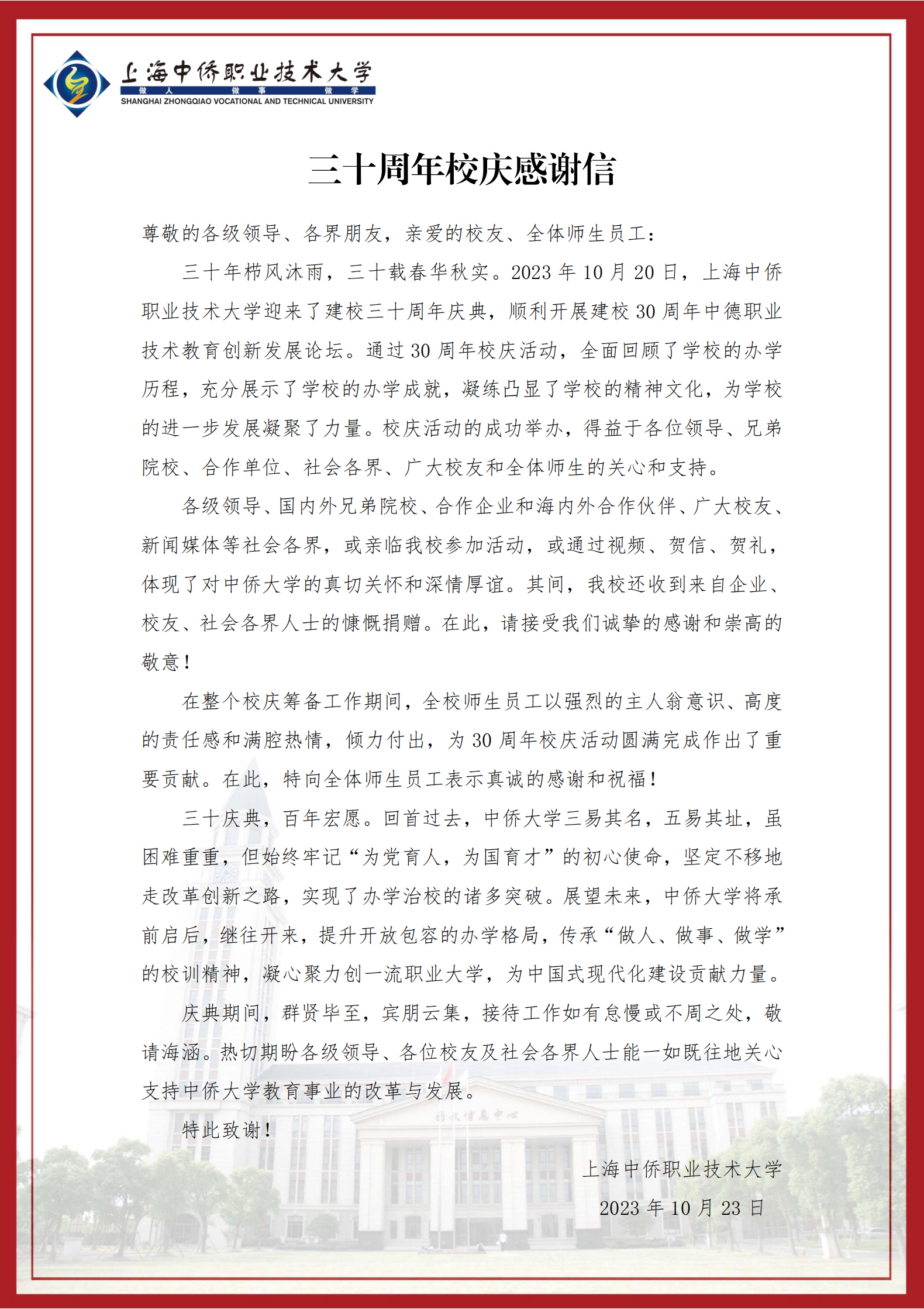 上海中侨职业技术大学30周年校庆感谢信