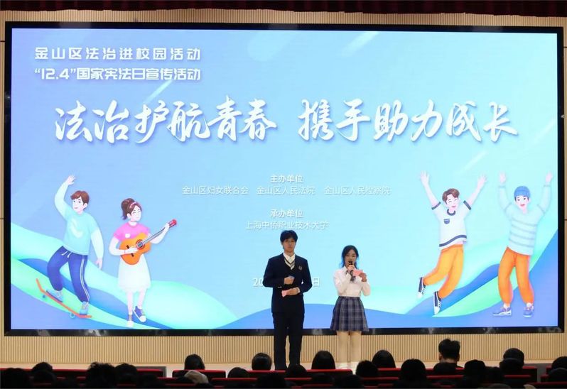 今年12月4日是第十个国家宪法日,上海中侨职业技术大学积极开展宪法宣传月活动。由金山区妇女联合会、金山区人民法院、金山区人民检察院主办,上海中侨职业技术大学承办的“法治护航青春 携手助力成长—金山区法治进校园活动”于12月1日在学校图书馆2楼学术厅举行,金山区妇联维权干部时蓓莉,区检察院第一检察部副主任施翀,区法院民庭审判员江彧超,区法理情女子会秘书长、上海金亭律师事务所律师葛怡忆,在校同学参与此次主题学习活动。