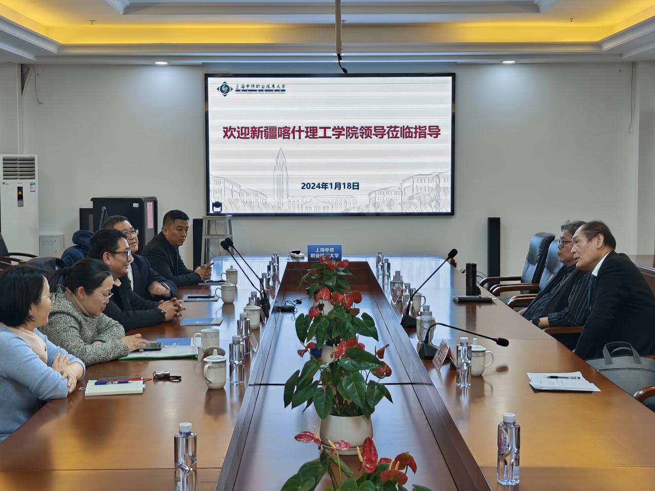2024年1月18日,新疆喀什理工职业技术学院校长干英俊来校洽谈两校合作事宜。我校党委书记平杰、副校长冯晓、规划与质量管理处处长呼玉山给予热情接待,学校所在地张堰镇党委书记施文权、副镇长李文等参加座谈。