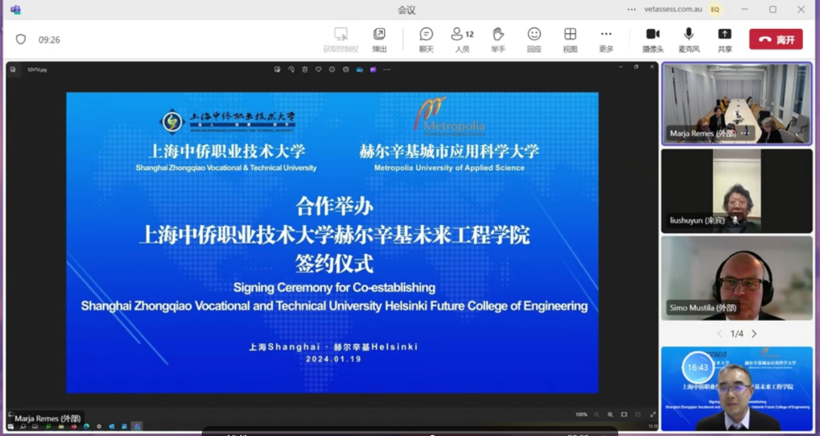 北京时间2024年1月19日下午,上海中侨职业技术大学与芬兰赫尔辛基城市应用科学大学合作签约仪式在线上隆重举行。出席此次会议的有上海中侨职业技术大学校长霍佳震、副校长刘淑芸、食品学院院长吴酉芝、建工学院院长朱小利、国际交流处处长王凌、国际交流处副处长胡雅楠以及华世达集团国际教育中心主任赵刚等中方代表。同时,赫尔辛基城市应用科学大学的校长Riitta Konkola, 副校长Simo Mustila, 国际合作部主任Marja Remes, 法务部主任Sanna Saarnia以及理学院院长Jari Olli和建筑学院院长Jorma Sateri等芬方代表也出席了签约仪式。此次会议标志着两校将展开一系列深入的教育合作,共同探索职业教育的未来。