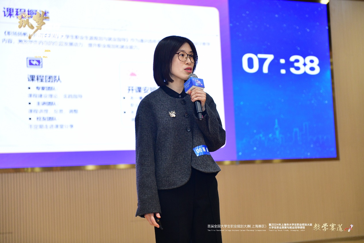 本次比赛分为资料提交、市级复赛、市级决赛和市级总决赛等多个环节,参赛选手来自上海市各个高校,竞争异常激烈。在分组决赛中,陈曦老师通过8分钟的课程建设情况汇报,全面展示了课程的基本信息、设计思路、建设与改革成果、特色创新以及实施成效等内容。随后,在5分钟的互动答辩环节,陈曦老师根据评审团成员的提问,进行了精准而深入的回答。在市级总决赛的现场情景模拟考核中,陈曦老师展现了其在就业观念引导、政策解读、简历修改、面试辅导等方面的专业能力。大赛组委会将根据市级决赛选手综合评价情况,按照教育部分配的高教组、职教组名额,推荐选手参加全国大赛。