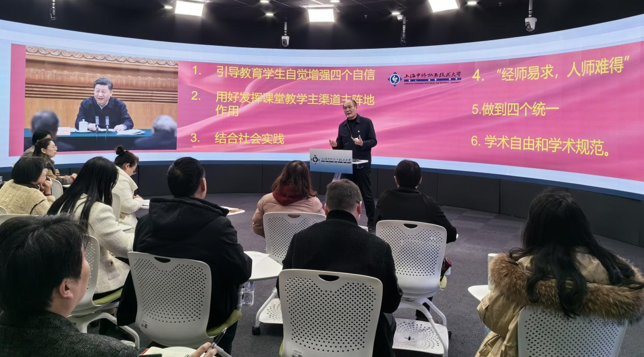 在听取各位思政课教师的讨论发言后,金山区委党校郜工农教授感慨颇深,他表示,习近平总书记“3.18”重要讲话精神是新时代学校思想政治理论课建设的纲领性文件,在“大思政课”建设过程中,思政课教师更要善用当地资源,上好大思政课。随后,郜教授紧紧围绕2007年习近平在金山调研时提出的“三个百里”重要指示,以“践行‘三个百里’重要指示,绘就‘乡村振兴’多彩画卷”为主题向全体思政课教师作主题报告。他提出,上海中侨职业技术大学地处金山,思政课教师可以充分利用当地现有资源,引导学生开展社会实践,将思政小课堂与社会大课堂有机结合,充分发挥思政课立德树人的关键作用。