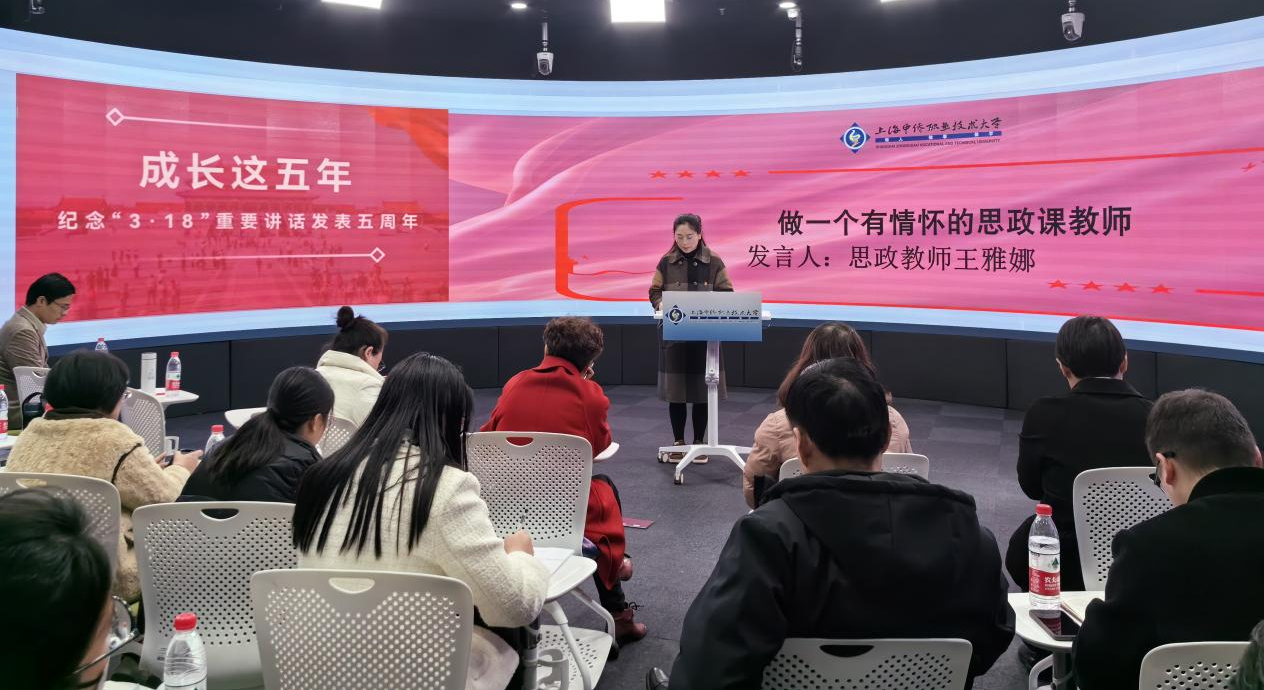 今年是习近平总书记在学校思想政治理论课教师座谈会上发表重要讲话五周年,为深入学习贯彻习近平新时代中国特色社会主义思想,推动思政育人工作高质量发展,总结部署学校思政课改革创新相关工作,3月15日,上海中侨职业技术大学在数字全景会议室召开“牢记习近平总书记‘3.18’重要讲话精神,做党和人民满意的思政课好教师”座谈会。党委书记平杰及马克思主义学院全体思政课教师参加座谈会。马克思主义学院教师于跃跃主持会议。