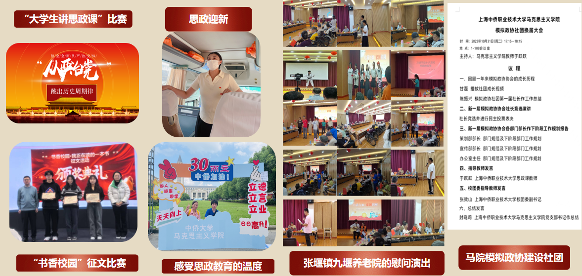 马院教师积极参与学校工会、学生处、团委的各项活动,参与各二级学院的课程思政建设。学院大力构建校外实践教学基地,积极推进思政课教育教学改革,先后与上海市金山抗战遗址纪念馆、中共二大会址、金山区张堰镇桑园村、山阳田园、九堰养老院签订合作协议,创建了五个校外思想政治理论课实践教学基地。学院联合九堰养老院,在线上线下相继开展了联欢会,受到养老院老人及家属的一致好评;与恒德里社区建立志愿者服务项目,组织学生积极参与社区服务实践,更好地助力社区服务和治理。学院成立模拟政协协会,组建了一支稳定活跃的青年志愿者团队,建立了定期沟通联络平台,同时链接高校、社区、专家各方资源,挖掘社区故事,传承和发扬红色精神,引导青年大学生将满腔热情落实到社区治理和社会服务工作当中,引导学生充分认识国情、社情和民情,为基层治理增添新鲜血液。 通过院校共建、校社共建、校企共建、校地共建,学院的发展质量进一步提升,硬件上学院的办公环境有了很大改善,软件上整个学院的课程体系进一步完善。