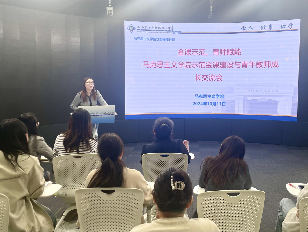 为贯彻落实二十届三中全会精神和全国教育大会精神,推进马克思主义学院攻坚提质计划和学院示范金课建设工作,助力青年教师成长,10月11日,马克思主义学院在图书馆全景教室开展示范金课建设与青年教师成长交流会。马克思主义学院常务副院长张天喜、教学副院长郭晓平及马院全体教师参加,会议由郭晓平主持。