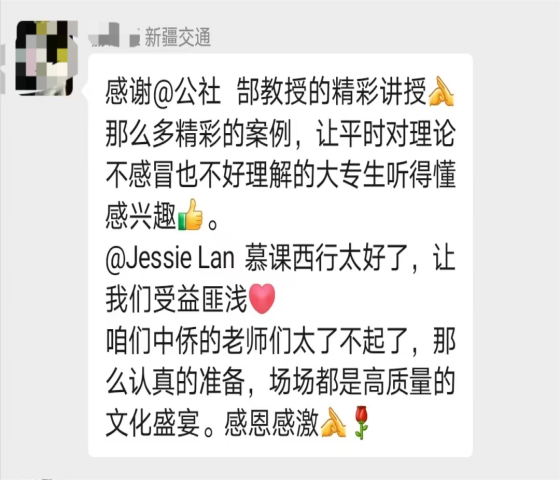 课后,新疆交通职业技术学院的师生表示,郜教授深入浅出的精彩演讲让学生们享受了一场“高质量的文化盛宴”,刘咏玲老师的语言魅力和灵活运用教学案例的能力不仅活跃了课堂氛围,同时也激发了大家的学习兴趣。这种独特的跨地域学习体验实现了两校学生在云端共同创新、优质课程共学共享的美好愿景,希望两校能够以此为契机,搭建多元化的交流合作平台,在学科建设、人才培养以及课程建设等方面开展更密切的合作,携手打造东西部职业院校同步课堂合作交流的典范。