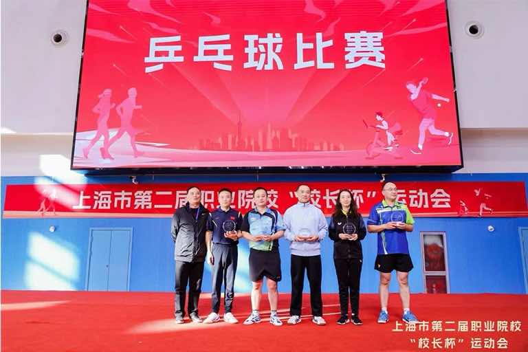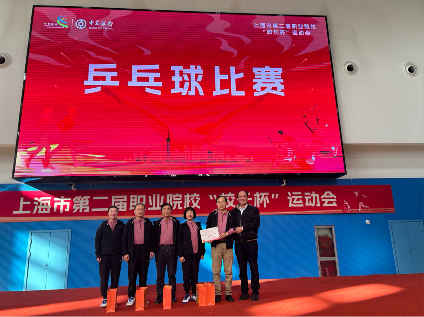 上海中侨职业技术大学党委副书记朱范鑫为乒乓球比赛获奖者颁奖