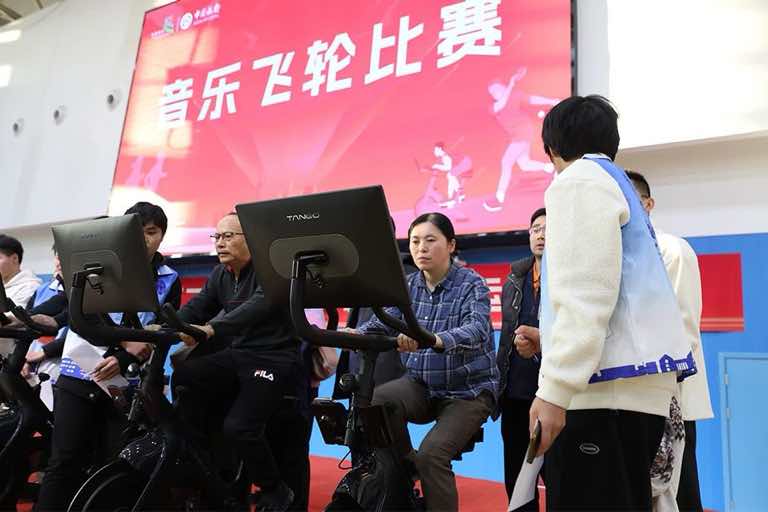 音乐飞轮项目则是技巧与节奏的挑战,展现了参赛者们出色的律动感和协调性。在学生志愿者们一对一的指导下,选手们随着音乐的节奏调整自己的频率和呼吸。他们流畅又富有韵律的动作,展现了音乐飞轮项目的独特魅力。这项运动不仅锻炼了选手们的下肢力量,更是对耐力和节奏感的一次挑战。