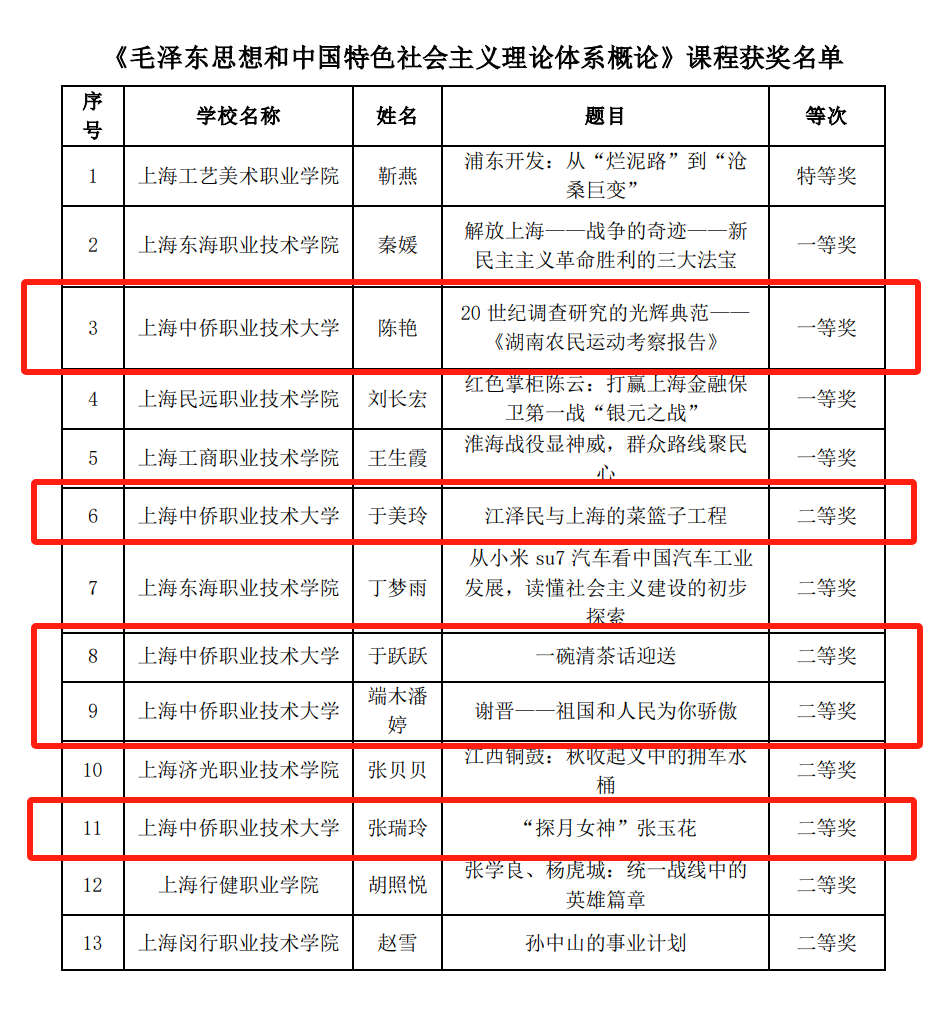 在2024年上海市高职高专院校思想政治理论课教学案例设计竞赛中,《习近平新时代中国特色社会主义思想概论》《思想道德与法治》《毛泽东思想和中国特色社会主义理论体系概论》三个课程的总奖项数目为39项,马克思主义学院获得的奖项总数为13项,喜获一等奖2项、二等奖11项,获奖数量在全市高职高专院校中名列前茅。这些成绩充分体现了马克思主义学院在思想政治教育教学改革中的突出成果,也彰显了马克思主义学院教师的教学能力、理论素养和创新意识。